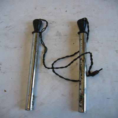 Parecen ser un tipo de calentadores de agua u otro líquido. Están formados por dos piezas metálicas alargadas, con mangos de plástico. Están unidas por un cable eléctrico con un enchufe para unirlo a la corriente eléctrica.