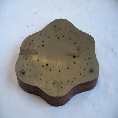 Aparato de perfil ondulado, formado por dos piezas, que tiene la misma forma, y se superponen: -Una inferior de madera (pieza nº1), con tres tornillos y dos plaquitas metálicas centrales con dos huecos cada una. -Otra metálica, con la misma forma que la anterior, con tres agujeros más grandes que encajan con los tornillos de la otra pieza, y múltiples agujeros más pequeños, distribuidos por toda la placa menos el centro.