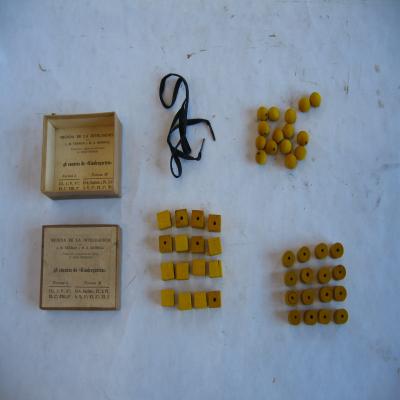 Cajita que contiene 47 cuentas (falta una) de madera de color amarillas, hay 16 cuadradas, 15 redondas y 16 cilíndricas. Todas ellas están atravesadas por un agujero. Además de las cuentas hay una cordón de color negro.