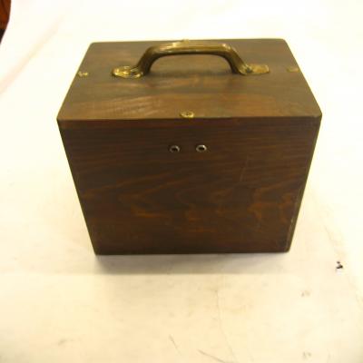 Instrumento. Es una caja de madera cerrada, con asa de metal. La parte superior está atornillada. En un lateral hay dos agujeritos que parecen ser para meter dos clavijas, por lo que el aparato podría ser eléctrico.