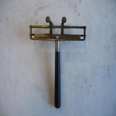 Estesiómetro?. Es una herramienta para medir la agudeza táctil. Está formado por un mango con funda de plástico negro y un varias piezas perpendiculares al mango, con dos reglas simétricas de 0 a 4cm. Sobre las reglas se sitúan dos piezas que se pueden mover con unas tuercas laterales; estas piezas tienen forma alargada que se estrecha en la punta. Hay que pinchar en diversas partes del cuerpo. Hay que ir abriendo el compás hasta que la persona note los dos pinchazos. Entonces se mide con la regla a que distancia estaban separados los dos palillos cuando noto los dos pinchazos.