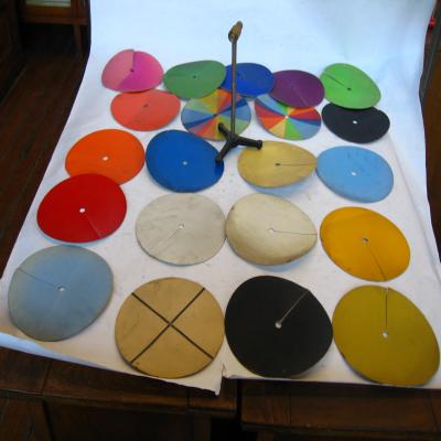 Aparato giratorio y conjunto de 21 discos de diversos colores, incluso alguno a modo disco de Newton. Los discos se colocan en el aparato, y se hacen girar, de forma que se puede observar la suma de los colores. Algunos de los discos permiten unirse de dos en dos, dando combinaciones. El aparato está formado por un soporte de tres pies, y una pieza vertical que finaliza en un dispositivo para colocar los discos y poder girarlos.