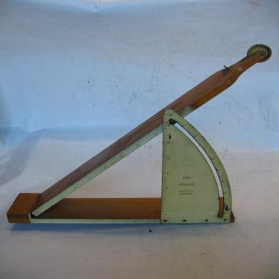 Es un plano inclinado, que es una máquina simple, que permite reducir la fuerza que es necesaria realizar para elevar una carga, y permite medir el rozamiento de los cuerpos. Permite comprobar las distintas relaciones de carácter vectorial (suma y descomposición) para las fuerzas que actúan sobre un cuerpo situado sobre un plano inclinado. Está formado por dos tablas unidas por uno de los extremos, de forma que se pueden separar o unir por el otro, formando arcos de círculos. Las dos tablas tienen una regla en el lateral, que en la superior va del 0 a 50, y en la inferior llega de 0 a 30. También hay una pieza en forma de vela de barco, que permite unir o separar las dos tablas, indicando por el lado plano la altura (de 0 a 30) y por el lado curvo el ángulo formado por las dos tablillas (de 0 a 45º). La tablilla superior tiene una polea en el extremo, lo que permitía a través de una cuerda atar un cuerpo que se apoyaría sobre el plano inclinado, y por el otro lado un peso u otro cuerpo que haría de contrapeso. Es de color madera, salvo los laterales de los planos y la pieza en forma de cela que son de color amarillento.