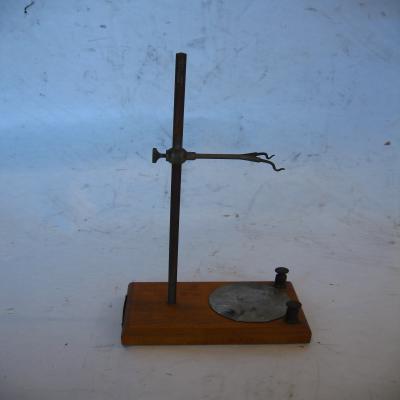 Péndulo electrostático. Este instrumento permite observar la fuerza electrostática que actúa sobre un cuerpo. Es el dispositivo clásico para manifestar visiblemente la inducción y atracción electrostáticas, así como el reacomodamiento de cargas en un conductor. Este péndulo consiste en un soporte de madera con una varilla de metal en vertical a la que se une una pieza de metal con dos especie de ganchos. En estos ganchos irían colgadas de hilos, de forma independiente, las dos bolitas con las que se podría realizar el experimento, y que no se conservan. En este péndulo podemos separar las siguientes piezas: 1-El soporte con la varilla metálica vertical. 2-Una plantina de metal redonda y plana, que se situaría debajo de las bolitas. 3- Pieza de metal con dos ganchos de donde se colgarían los hilos con las bolitas.