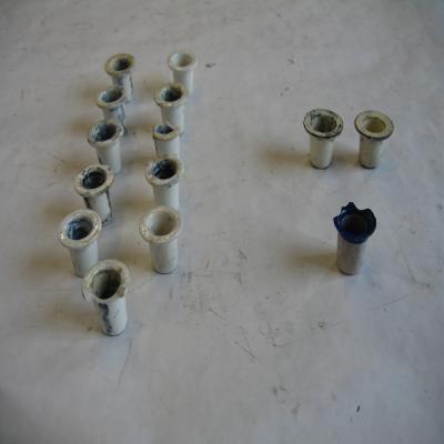 Catorce tinteros pequeños de mesa. Son de porcelana, en forma de vasitos pequeños. Son todos de color blanco, aunque hay uno que tiene el reborde azul. Se distinguen un total de tres modelos diferentes: 11 con rebode redondeado, todos blancos; 2 blancos, con rebode plano; 1 con reborde azul. Eran utilizados por los alumnos, el profesor era el encargado de rellenarlos cuando a un alumno se le acababa la tinta.