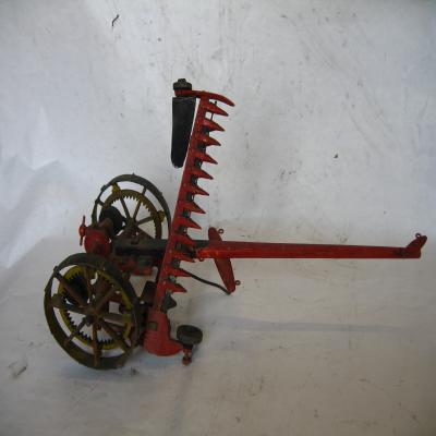 Modelo de guadañadora que realiza trabajos de corte de malezas y rastrojos. Es de metal y madera pintada de rojo. Está formado por una eje, probablemente para unirlo a alguna máquina o animal, que aal otro extremo acaba unido a un eje con dos ruedas, una en cada extremo. Además hay una pieza perpendicular al eje, formada por una línea de dientes de metal (para trabajar la tierra), que en cada extremo tiene una pequeña ruedecita, y en uno de ellos una pieza a modo de pala.