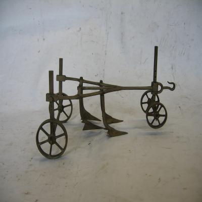 Modelo de arado múltiple, todo de metal. El arado, también denominado apero de labranza, es una herramienta utilizada en agricultura para preparar y remover el suelo antes de sembrar las semillas. El arado tradicional tirado por animales procede del arado romano, que consta de una esteva (para guiar) y reja (de hierro) que es la que rompe el terreno. Está formado en la parte de atrás por dos ruedas, una a cada lado y en la parte delantera otras dos ruedas, pero esta vez más cercanas. Entre medias de las cuatro ruedas encontramos un sistema formado por 5 "rejas", en forma triangular, situadas en dos filas, una trasera de tres rejas (falta una) y una delantera de 3. Delante de las ruedas delanteras hay un gancho, para unirlo al mecanismo de arrastre (máquina motorizada, animal de arrastre…).