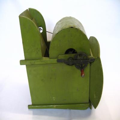 Empaquetadora de paja. Es una especie de caja de madera, de color verde, con compartimentos internos. En un lateral tiene una especie de manivela, que al moverla activa el mecanismo interno.