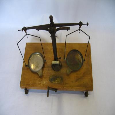 Balanza. Está formada: 1-Por una base de madera, rectangular, con patitas de metal. En la parte delantera tiene una manivela de metal que permite subir y bajar el brazo basculante. Del centro de la base sale una pieza cilíndrica de metal, con una escala en la parte inferior. En la parte superior de esta pìeza se asienta el brazo basculante. 2-El brazo basculante con la aguja. De los lados del brazo basculante se cuelgan los "columpios" que soportan los platillos. 3 y 4-Los dos "columpios", de metal, con base sobre la que se colocan los platillos. 5 y 6-Los platillos, de metal.