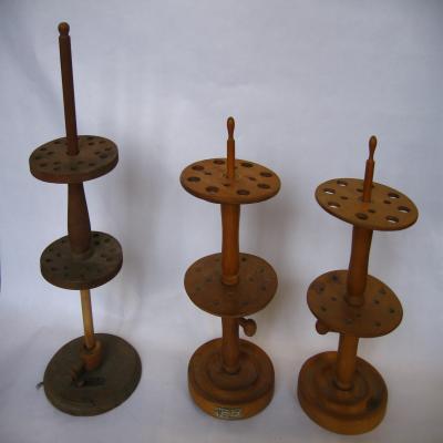 Tres soportes de madera, para colocar pipetas. Hay dos modelos diferentes, pero la estructura es muy similar. Dos de ellos son iguales, de color marrón claro, y el otro es más alto y más oscuro. Están formados por una base de madera, circular, de la que sale centralmenteuna pieza vertical de madera. Sobre esta pieza se sitúa, de forma más basal un disco circular de madera, con agujeritos, casi todos con fondo. Después le sigue una pieza de madera, y sobre ella otro disco de madera, esta vez con agujeros de diferentes tamaño, que transpasan la madera. Parece que los objetos que se colocan, han de transpasar la primera madera por los agujeros, y apoyarse en la segunda.
