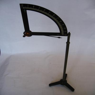 Cuadrante. Instrumento compuesto por un cuarto de círculo graduado para medir ángulos. El cuadrante está situado sobre un soporte con base de tres patas. Podemos separarlo en dos piezas: 1-El cuadrante: de metal de color negro, con una escala en el arco de 0 a 12, y una pieza en el vértice interno que sostiene dos agujas, con una distancia aproximada de 90º. 2-El soporte: de metal, con un base de tres patas.