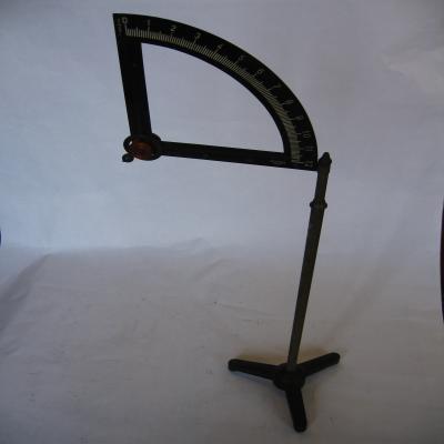 Cuadrante. Instrumento compuesto por un cuarto de círculo graduado para medir ángulos. El cuadrante está situado sobre un soporte con base de tres patas. Podemos separarlo en dos piezas: