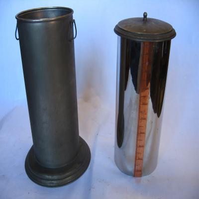 Instrumento. Podría ser un pluviómetro. Consiste en un bote cilíndrico de metal, con dos asas y una tapa. Al levantar la tapa lleva unido otro cilíndro metálico, este abierto por abajo. Este cilindro lleva en la cara externa una escala vertical de 1000 a 5000.