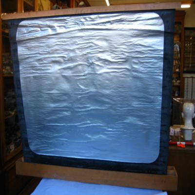 Tipo de pantalla de proyección. Consiste en una pantalla plegable, situada dentro de una caja de madera, que al abrirla, se puede extender la pantalla que se mantiene erguida gracias a unas piezas de madera situadas en la parte posterior. La pantalla es negra con el centro de color plata.