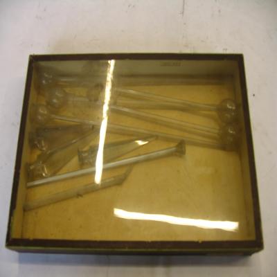 Conjunto de material de vidrio, formado por: -Cinco piezas que parecen buretas o pipetas. Están formadas por una especie de copa superior donde se coloca el líquido, comunicada con una columna de cristal abierta hasta el otro extremo. -Tres piezas de cristal a modo de tapón o similar. Tienen una especie de botón superior con un hueco central, unido a una especie de triángulo de cristal alargado. -Un tipo de bureta formado por un pequeño embudo en la parte superior, unido a una columna de cristal abierta con una zona de la pared de color blanco. Está rota en la parte inferior. -Una especie de bureta de tipo cerrada. Tiene forma de ampolla, con un final curvo, estrecho, abierto, y antes de la curva una unión con otro tubo (que no se conserva) por el que entraría el líquido.