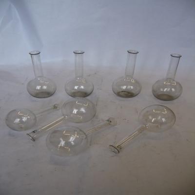 Conjunto de ocho matraces de cristal. Tienen la base a modo de ampolla, de burbuja, de loa que sale un cuello largo. Cuatro de ellos tienen la base de la burbuja plana, de forma que se puede mantener de forma vertical; los otros cuatro tienen la burbuja redonda, por lo que no se mantienen erguidos.