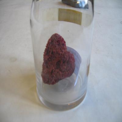 Esqueleto de coral colonial en forma de tubos formados por escleritos soldados y sin varilla de gorgonina (característica del orden). Color rojo.
