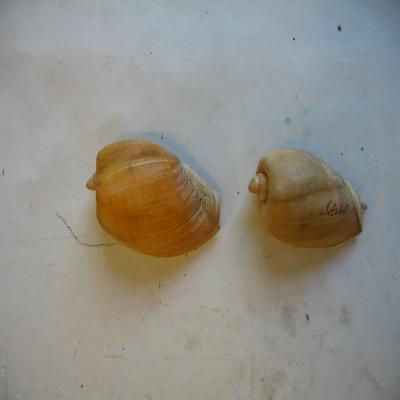 Dos conchas alargadas, finas, de líneas redondeadas, con el ápice en forma de bola inclinada y la última espira más gruesa. Profundo canal de sutura sobre la última vuelta. Estrías transversales. Color pardo. Interior color crema, brillante, boca muy amplia, acabada en una especie de escotadura. Columela estriada