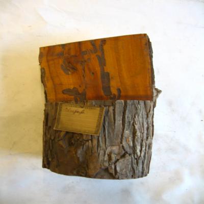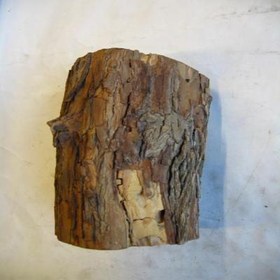 La corteza no es muy gruesa, pero es muy rugosa, escamosa, con zonas desprendidas. Superficie muy irregular. Tiene la base de una rama. Color pardo-grisáceo. La madera tiene algunos agujeros.