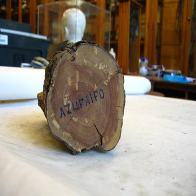 El tronco lleva unida con un pequeño clavo a la corteza una pequeña etiqueta, antigua, con inscripción a máquina y bolígrafo: \UNIVERSIDAD CENTRAL. Azufaifo. Gabinete de Historia Nat.\. En el extremo completo tiene escrito con rotulador \AZUFAIFO\.
