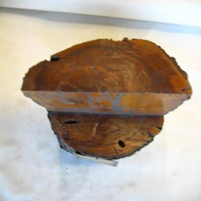Hacia la mitad de la pieza, se ha cortado longitudinalmente y transversalmente, de modo que la mitad del tronco está completa, y la otra sólo conserva la mitad longitudinal. Este corte permite ver el interior de la madera.