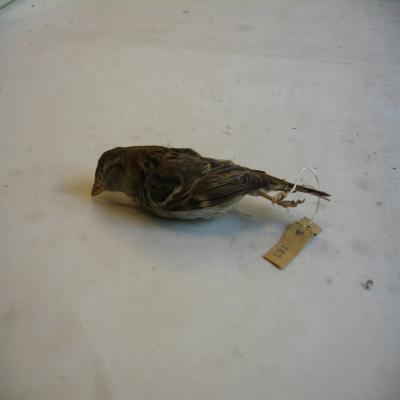 El ejemplar tiene unida a la pata una etiqueta con inscripción a lápiz "Passer domesticus", y el número "165" escrito a máquina.
