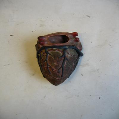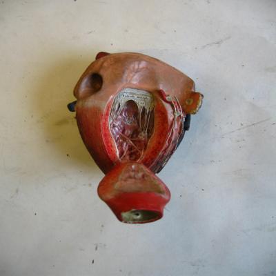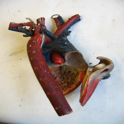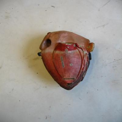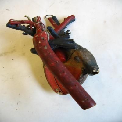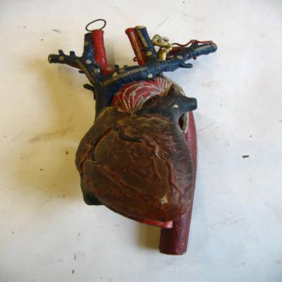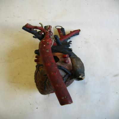 Modelo de corazón humano. Grande, muestra los vasos sanguíneos principales (aorta, vena cava, vena pulmonar, carótidas..). El corazón se puede dividir en dos piezas, como si dejasen a un lado cada pieza una aurícula y un ventrículo. Cada pieza puede abrir un pequeño compartimento, mostrando en su interior las válvulas cariacas. La pieza pequeña muestra la válvula mitral, mientras que la grande (posee las arterias y venas) contiene la tricúspide. También se observa el agujero de Botal, la válvula de Eustaquio y el canal arterial (características del corazón de feto).
