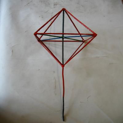 Modelo de forma cristalográfica. Representa un octoedro, perteneciente al sistema cúbico. Las aristas externas son rojas, mientras que los ejes internos son azules, verdes y negras.