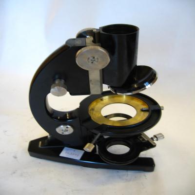 Microscopio alemán. Es de color negro, con un ocular y capacidad para cuatros objetivos. Se puede descomponer en las siguientes piezas: