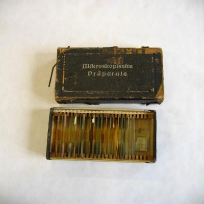 Dentro de una cajita negra, con inscripción en la tapa \Mikroskopische Präparate\. Hay preparaciones que proceden de diversas casas, la mayoría francesas y alemanas aunque también las hay españolas.